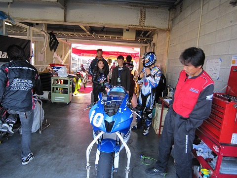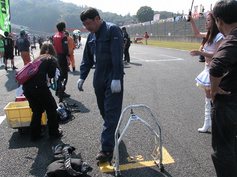 10:58 グリッドで 23番グリッドに着いて、國川選手が来るのを待ちます。 SUGOの時は、ピットからあまりに遠くて、ピットクルーより先にバイクがグリッドに着いちゃいましたけど。 今日は大丈夫でした。(笑) |