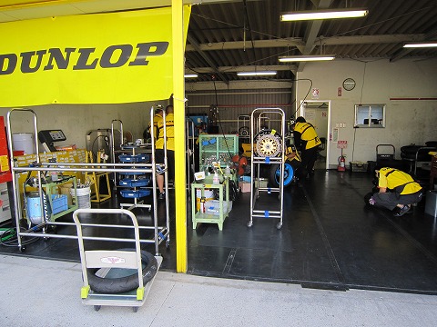9:05 タイヤを交換 ウォームアップ走行後は毎度のDUNLOPにタイヤ交換。 昨日の転倒で、前後のホイールのリムを曲げてしまい、使えるホイールは2セット。 1セットはレイン用で使っているので、ウォームアップで使ったホイールに決勝用のタイヤを付け替えてもらいます。 ホイールが3セットあれば、雨用とウォームアップ用と決勝用で準備できるんですけどね。 |