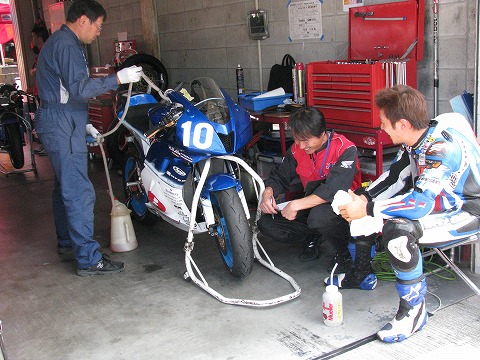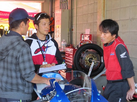 11:41 レースを振り返って レースが終わって、振り返って走行感覚をメカの清水さんとミーティング。 当然、納得できた走りじゃなく、厳しい表情をしています。 |