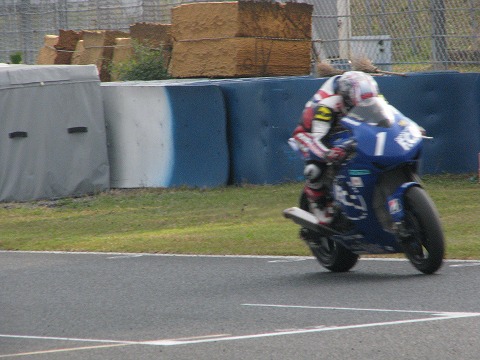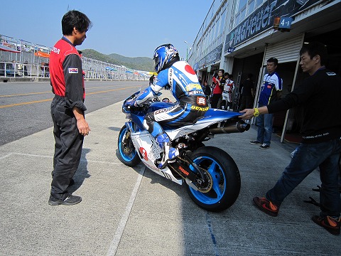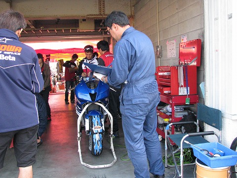 8:12 準備完了 セッティングの変更も終わり、カウルを付けて準備完了。 朝のウォーミングアップは、おニューのカウルじゃなく、昨日転倒したときのカウルを装着。 まさか、ウォーミングアップで転倒でもされて、カウルがギタギタになったら泣くに泣けないからね。 |