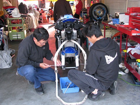 10:40 記念撮影 決勝のスタート進行は10:55から。 ちょっと時間の余裕ができたので、きれいになったカウルの前で記念撮影。 |