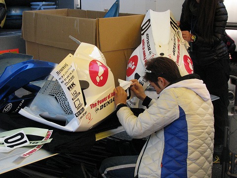 9:47 ゼッケン 交換したタイヤを装着し、タイヤウォーマーをかけておきます。 偉そうにメモを取っていますが、タイヤの空気圧を記録しているだけ。。 決勝に向けカウルも新品に交換。 ゼッケンもまだ貼ってませんね。 (^^;) |