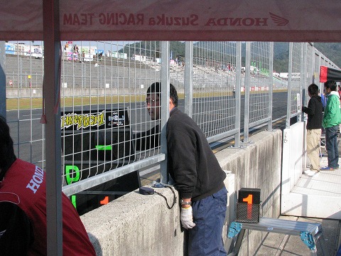 11:20 ピットロードへ 11:10定刻になり、ST600クラスのレースが始まりました。 レースが始まり、クルーはみんなピットロードへ。 みんなでSUZUKA RACINGさんの計時モニターを眺め、國川選手のレースを観戦・確認します。 |