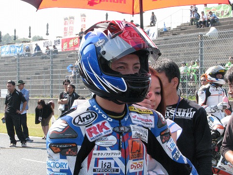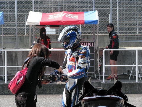 11:40 ピットに戻って レースが終わり、1周のクールダウンラップを終え、ピットに戻ってきました。 昨日の予選での転倒の痛みがあるようで、自分でグローブを外せず。 ピットクルーに手伝ってもらって、グローブを外します。 『お疲れ様です!』 |