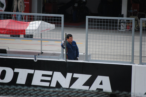 9:58 今日は楽勝! 國川選手がピットアウトした後、レーシングスタンド、セッティングの工具とタイヤ交換の工具、タイヤウォーマー、発電機そしてレインタイヤをグリッドに運びます。 これだけで、結構な荷物になります。 今回の鈴鹿のグリッドは、自分たちのピットから近くて助かりました。 今シーズン一番近い距離で、グリッドに駆けつけるのは楽勝だね。(笑) |