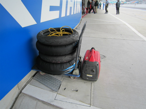 9:38 レインタイヤを準備 スタート進行は9:55から。 あと、15分ほどになりました。 曇り空は、ますます怪しくなってきます。 ピット上で、レインタイヤに交換する可能性も出てきたので、ピットレーン脇にレインタイヤを準備しておきます。 |