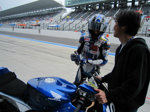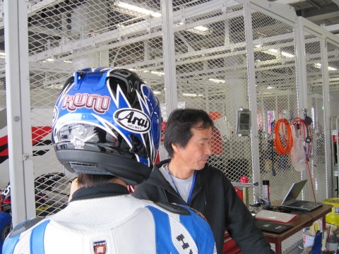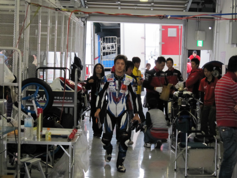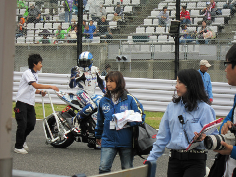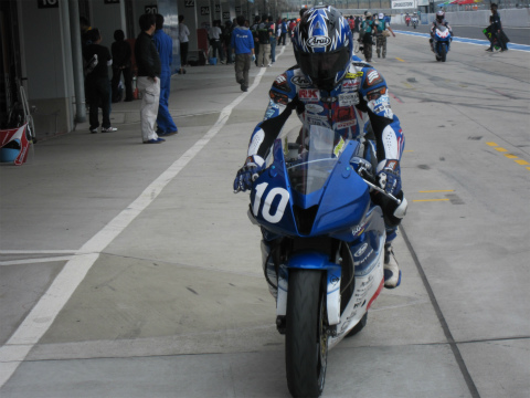 9:49 レースを始めよう ピットスタート5分前になり、國川選手がレザースーツに着替え戦闘の準備を整えピットにやってきました。 『さあ、レースを始めよう!』 |