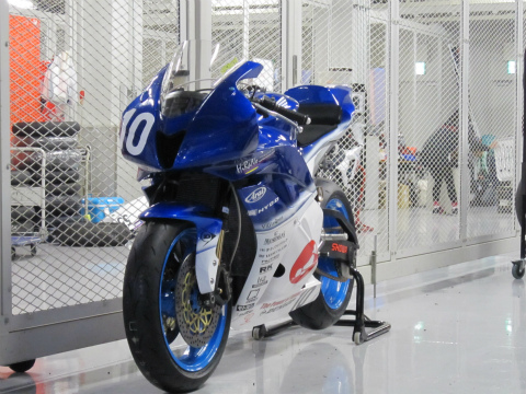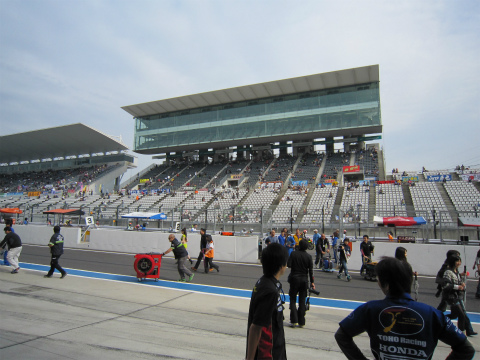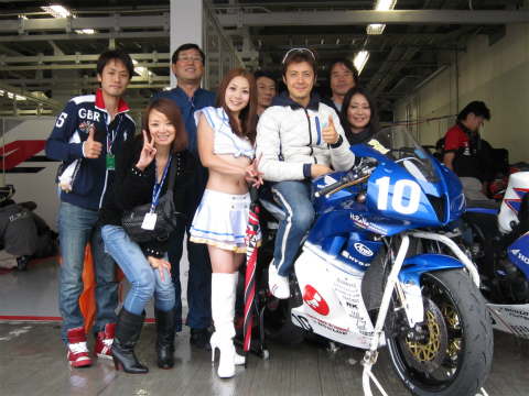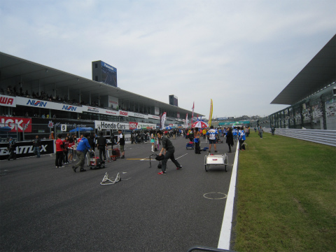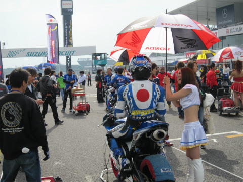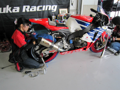 11:09 隣のピットのSUZUKA RACINGもマシンをピットに戻し、マシンを待機。 晴れに好転すると読んでか、タイヤは交換せずスリックタイヤのまま、ウォーマーを巻いて、決勝を待つようです。 HONDAの社内チームのSUZUKA RACINGは女の子もメカとして働いているんですね。 |