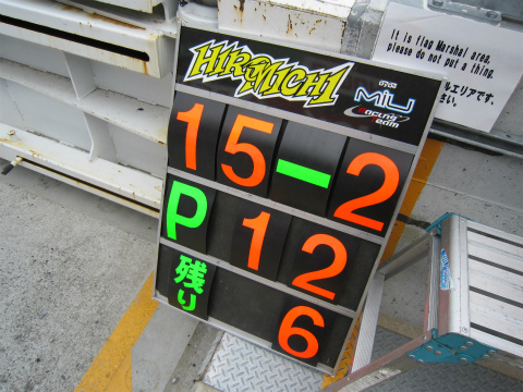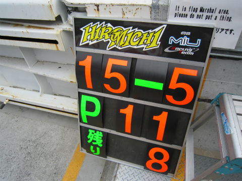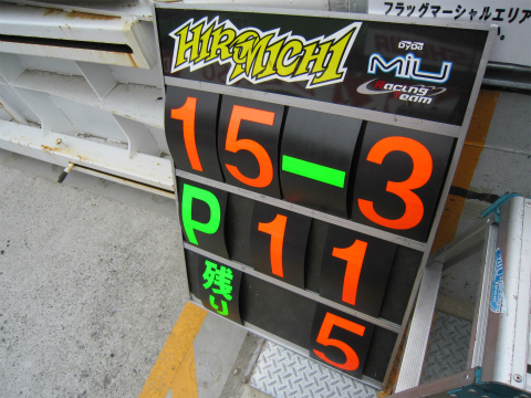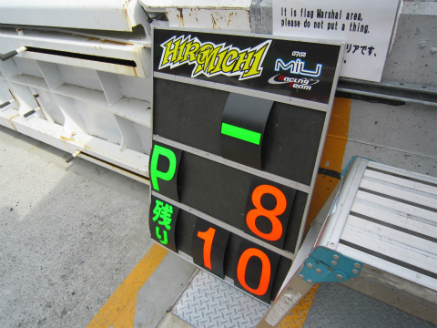 10:15 2周目 1周目を終えて、ホームストレートに戻ってきた國川選手。 ポジションは1つ落として、8位。 1周目に戻ってきたときには、タイムも、ポジションもわからないので、サインボードに出すのは残りの周回数だけ。 1周目はサインボードの位置を確認してもらう意味もあるので、残り周回数だけですが、出します。 このサインボードは2周目を終えた時点で出すサインボード。 タイムが計れるのが2周目を終わった時点からなので、まだタイムはなし。 |