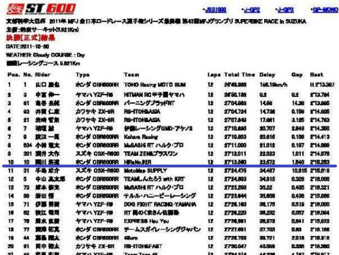 16:58 2011年のリザルト 2011年シーズンのリザルト 第1戦 筑波:東日本大震災のため、中止。 第2戦 オートポリス:レース1、18位 レース2、12位。 第3戦 ツインリンクモテギ、9位 第5戦 SUGO、20位 第7戦 岡山国際、15位 第8戦 鈴鹿MFJ GP 10位。 2011年ST600クラス年間ランキング16位。 |