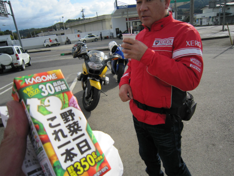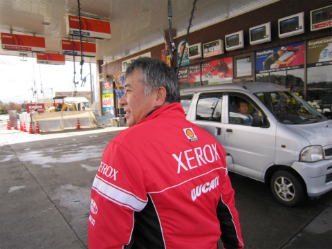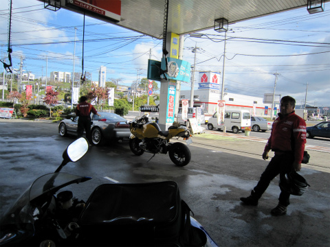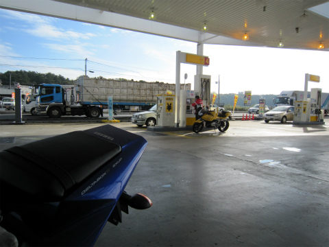8:35 ぼちぼち ジュースジャンケンも終わって、ぼちぼち出発します。 まずは、お向かいのガソリンスタンドに行って、給油。 |
