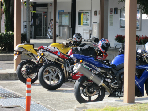 10:01 友部SA 土浦北ICで常磐自動車道に上がり、友部のサービスエリアまで来て、チクと休憩。 『じゃんけん、する?』 『いやいや、ちっと早すぎでしょう』 と言うことで、トイレ休憩ですぐに出発。 今日は3台そろって赤・黄・青の”信号機色トリオ”で参ります。 |