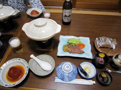 18:40 夕食は 部屋に案内された後、温泉へ。 他のグループはまだ到着していないので、温泉は貸し切り状態で、のんびり入ることができました。 (*^_^*) 温泉に入った後、6時半から広間でお待ちかねの夕食です。 夕食は、奇を衒(てら)ったものはなく、ごくごく普通の夕食です。 それでは、『いただきます! (^o^)/』 |