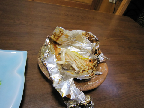 18:45 ちゃんちゃん焼き アルミホイルに包まれていたのは、シャケのちゃんちゃん焼き。 秋の味覚、シメジとエノキ、それにシャケがアルミホイルに包まれ、バターで焼き上げられて美味しい! (^o^) |
