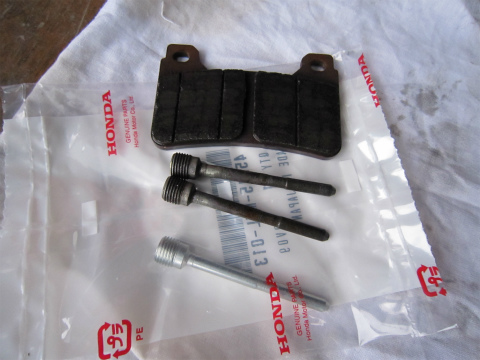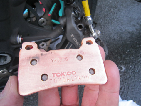 16:08 新品のパッド 新品のパッド。 CBRの純正。 HRCスペシャルじゃありません。 完全ノーマル。 これで、効きは十分。(他のを使ったことが無いので、比較できない) ただ、サーキットで使うと、結構減りが早いね。 履歴を見ると、大体500〜600kmで交換している。(サーキットだとそんなもんかな?) |