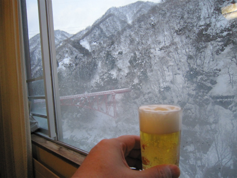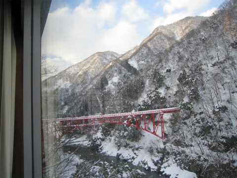 16:05 赤い鉄橋 去年は、日が暮れてからの宿入りでしたが、今年は明るい内に到着。 部屋の窓からは、黒部川に架かるトロッコ電車の赤い鉄橋が、雪の中に浮かび上がります。 ここから先は、去年も泊まった宿だし、このレポを書いているのが大幅に遅くなってしまい、今日は3月28日と時期を外してしまったので、あっさり書きます。 詳しく読みたい方は、去年のレポを読んで下さいな。 |