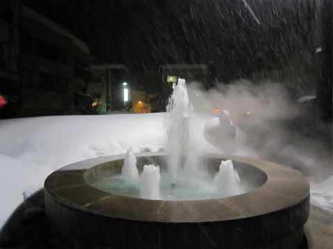 20:23 宇奈月温泉の駅前に到着しました。 今年は、良い勢いで雪が降っています。 駅前にあるのは”足湯?” じゃなくて、温泉の噴水。 (去年のレポを見たら同じことを書いていました。記憶力ゼロだね。(笑)) もうもうと湯気を立てて吹き上がってます。 宇奈月温泉は黒部川上流の黒薙温泉から送られてきますが、湯量が豊富ですね。 |