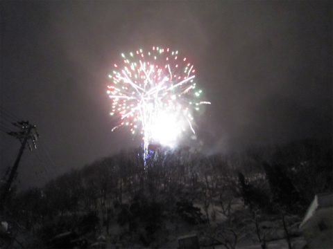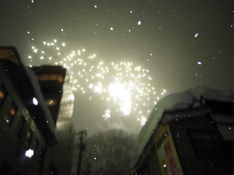 20:30 打ち上げ開始 8時半になって、花火の打ち上げが始まりました。 花火は、宇奈月温泉スキー場の山頂から打ち上げられているようで、間近に広がります。 そして写真には、花火の光に反射した雪が写っていました。 |