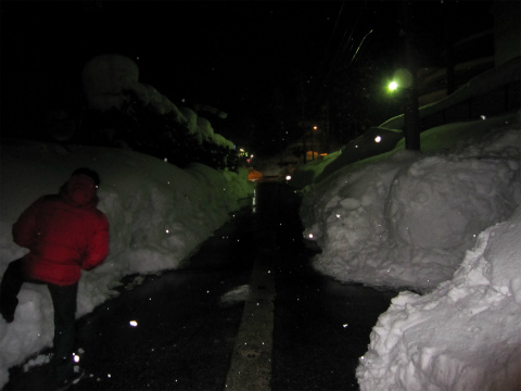 20:48 ホテルへ 花火が終わった帰り道は、ホテルまで歩いて帰ります。 帰りもバスが迎えにきてくれますが、大した距離じゃ無いので、だらだらと歩きます。 雪なんか蹴りながら!(笑) 別に酔ってないよ。 |
