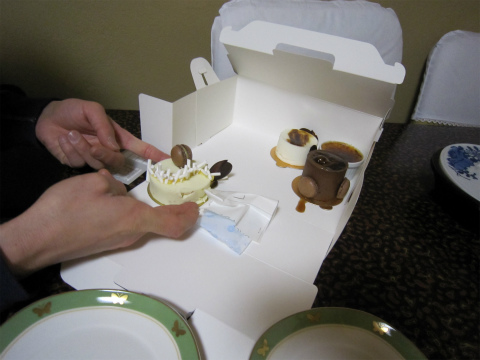 21:29 デザート 部屋に戻ったら、昼間ジラフで買い込んだスイーツをいただきくことにします。 上品に作ってありますね。 昨晩、徹夜で運転したアイスエイジさんは、花火も見に行かず、今も爆睡中!(笑) |