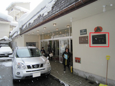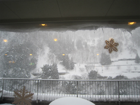 8:05 目が覚めて 朝、早く目が覚めたら、朝風呂に行こうと考えていましたが、目が覚めませんでした。 と言うか、目は覚めたけど、寝ていたかった。 そして、朝食の時間までしっかり睡眠。 8時になって、食堂に向かいます。 ロビーから外を見ると、 昨晩から降り始めた雪は、夜が明けてもまだ降り続いていました。 |