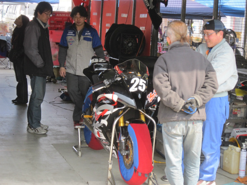 13:00 お隣り ピットのお隣は、兄弟チームのExpress HouYouの#25、清水直樹選手のマシン。 國川くんのメカも清水さん。 紛らわしいので、これから清水メカと書こう。 たぶん、明日には忘れている。(爆) |
