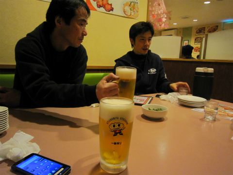 21:02 乾杯 まずは、ビールで『乾杯!』 國川くんはウーロン茶。 『今シーズンもよろしく。頑張ろう!』 國川くんはレースウィークは飲まない。 らしい。 意思が強いね。 |