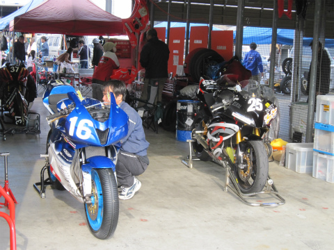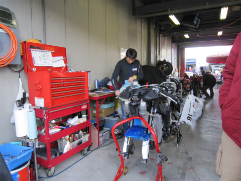 14:36 片付け中 13時にピットウォークも終わり、マシンをピットに戻しました。 そして、ヘルパーの人たちが作ってくれた料理で昼食。 そして、今はカウルを練習用のに戻したり、片付け中。 |