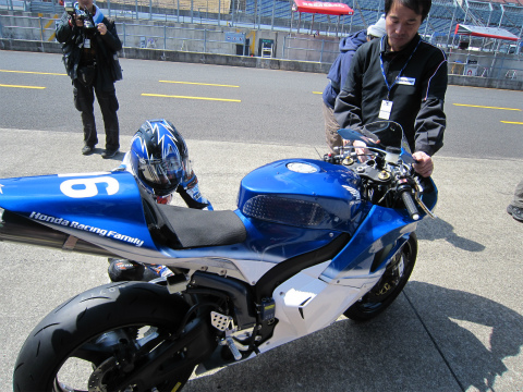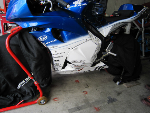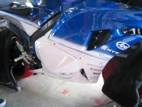 10:19 右側は カウル右側は、補修したため暑さ対策のドリリングの穴がまだ空いていません。 たぶん、次戦の筑波あたりで、一生懸命自分が空けるんだろうな。(笑) |