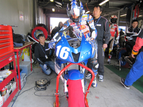 10:19 準備完了 決勝に向けての準備が終わりました。 カウルも決勝用に交換。 昨シーズンあった日の丸マークは無くなりました。 気温が低いので、タイやウォーマーの効きが悪く、ウォーマーの上にカバーをしておきます。 |