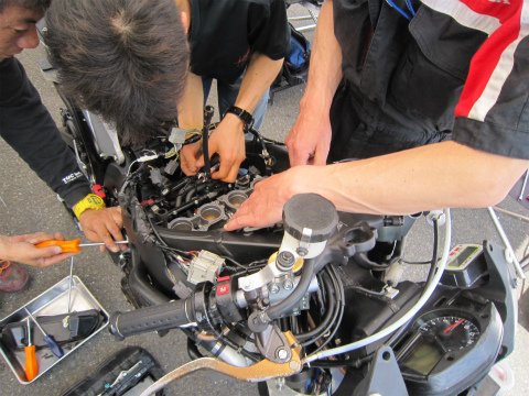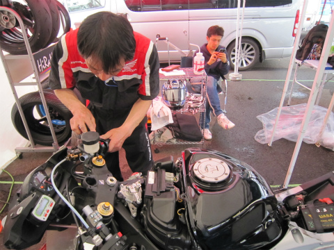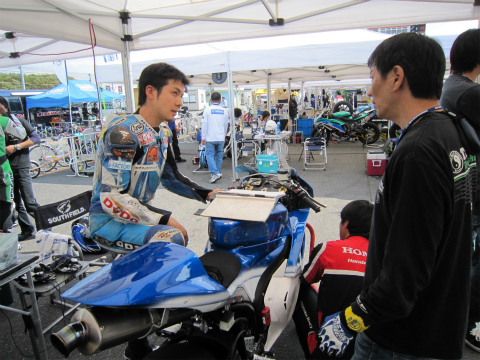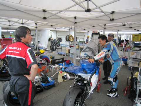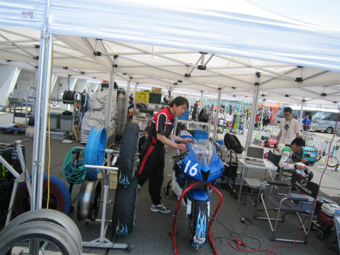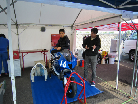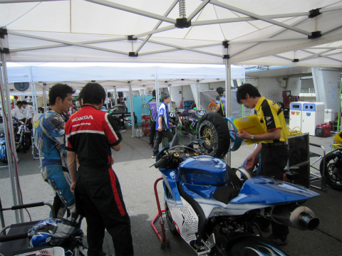 17:56 整備中 いつものように予選に向けての、マシンのセッティング変更と整備。 転倒とかがない限り、セッティングに必要な時間も大体読めるようになってきましたね。 そして、國川くんは今日の結果を自分のブログに投稿中。 |