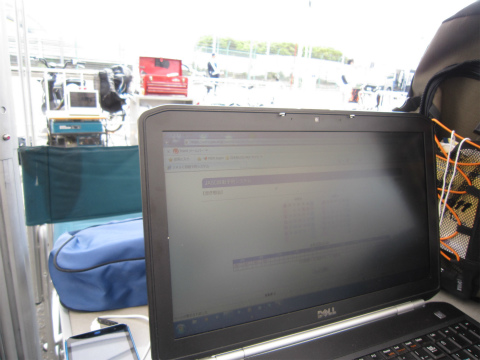9:57 翌月予約 コース上では、國川選手が走行中。 いつもであれば、サインボードを出していますが、今日はそれどころじゃありません。 今日は、筑波サーキットの6月分の走行予約日。 10時から予約が始まります。 土曜日の予約がなかなか取れなくて、予約開始の10時になったらすぐに予約しないと、良いところが予約できません。 なので、國川選手の走行は他のメンバーにまかせて、自分はパドックでパソコンでネットを開いて予約の準備。(爆) |