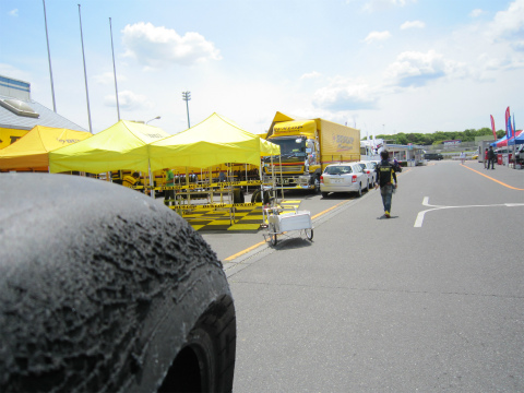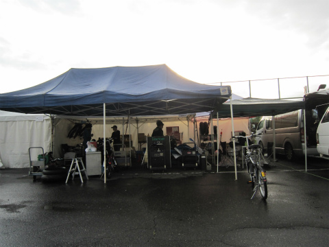 17:25 Bパドックに ベースのBパドックにマシンやら工具やら、タイヤとかを戻しました。 途中にわか雨があり、自分たちのテントがあるところは、低い位置にあって、水没するんじゃないかと心配しましたが、なんとか大丈夫でした。(汗) (昨日の搬入日には、水没して、國川くんは水を掻き出すのに大変だったみたいです。) |