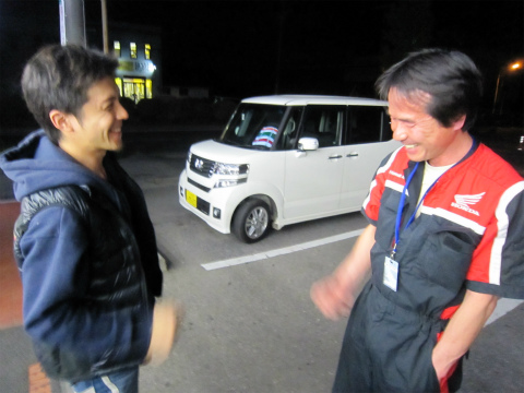 19:25 最後に セッティングと整備が終わりました。 今回は大型の蛍光灯を持ち込まなかったので、手元の蛍光灯と懐中電灯、それに車のヘッドライトの下での作業。 そして、最後はカウルにスポンサーさんのステッカー貼り。 これは、國川くんの仕事。(?) 1枚ずつ誠意を込めて貼ってます! |