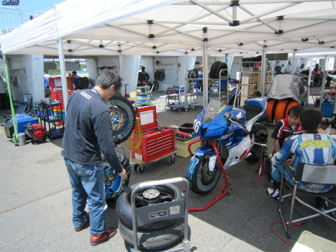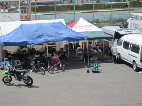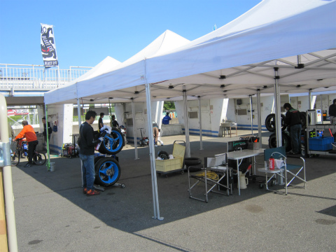 7:37 機材を移動 Bパドックに到着後、テントを開けて機材の準備。 そして、機材をピット裏にあるパドックに移動します。 レースウィークには、これを毎日繰り返し。 これで、雨でも降ろうものなら、もう大変。 でも、今年の筑波は大丈夫そうです。 |