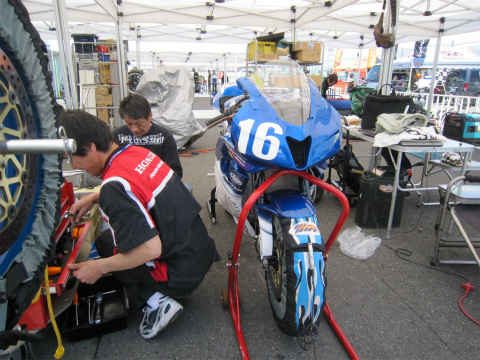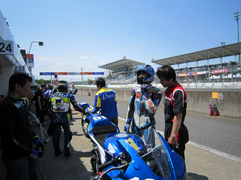 11:22 ミーティング中 午前中の予選結果を元に、午後の予選のセッティングについて、清水メカとミーティング中。 予選が終わってからすでに1時間近く経っていますが、いまだ皮つなぎを着替えずに熱談中。 |