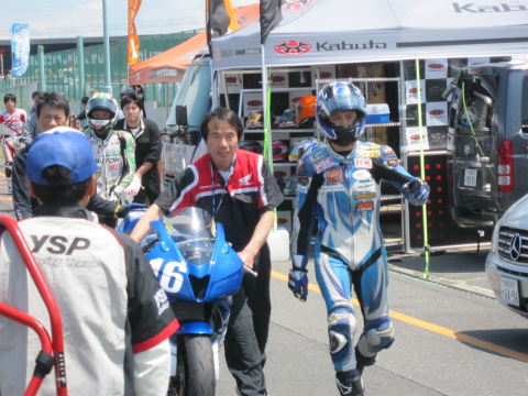 9:56 10分前 予選10分前になりました。 マシンの準備は完了。 國川くんも皮つなぎに着替えてパドックにやってきました。 Aグループの予選がちょうど今終了したところです。 Aグループは、SUZUKIのGSX-Rに乗る津田拓也選手が58秒084のコースレコードを叩き出し、現時点でトップに付けています。 今回のST600クラスの予選は、A・Bの2つのグループに分かれて行われますが、A・Bグループ間のコンディションをなるべく同じにするため、両グループ、午前と午後の2回の予選が行われます。 |