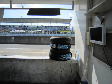 14:49 予選2回目に向けて 15:15から開始される予選2回目に向けての準備。 今回、予選は2回あるので、使えるタイヤは3セットです。 決勝用に1セット使うので、予選で使うのは2セット。 1回目の予選で1セット目を使っていますが、予選2回目は1セット目でスタートして、途中で交換する予定です。 ピットロード脇に2セット目のタイヤを準備して、予選2回目にのぞみます。 |