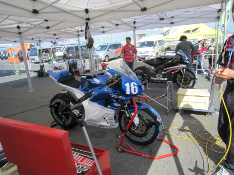 10:32 予選終了 1回目の予選が終了し、パドックに戻ってきました。 ライダーとパドックを押して歩く姿は、ピットロードとピットがつながっていない筑波サーキットならではのもの。 |
