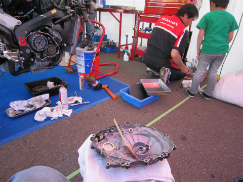 17:58 整備は続く 予選が終了し、明日の決勝に向け、整備を続けます。 いつものように、決勝に向けクラッチの交換。 そして、目の前に置かれたクラッチカバーの液体ガスケット取りは自分の仕事だ!(笑) そして、メカの清水さんはチームスポンサー様の息子さんに仕事を仕込み中。(笑) |