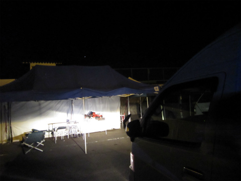 20:00 残業終了 今日の整備とセッティング変更が終わりました。 残業もここで終了。 テントをしまって、撤収することにします。 あとは、明朝のフリー走行の結果を確認して、最終的なセッティングを決定します。 |