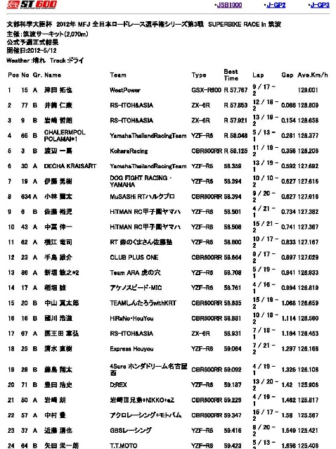 予選総合結果 予選の総合結果が発表になりました。 A・B両グループを合わせた予選結果は16番手。 明日の決勝は6列目アウト側からのスタートになります。 予選トップは、SUZUKIのGSX-R600に乗る津田拓也選手でタイムは57秒767と当然レコードタイムでした。 津田拓也選手自身ST600クラス初のポールポジションで、SUZUKIとしても・・・。 (SUZUKIがST600クラスでポールポジションを獲ったのを記憶がありませんが) |