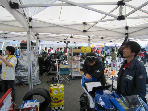 11:08 スタート進行 8:35に朝のウォーミングアップが終了。 パドックで、決勝に向けてマシンを整備。 決勝用に3セット目のタイヤに交換し、購入したガソリンを給油。 最終的なセッティングに合わせて、マシンを準備。 10:30から始まったJ-GP3の決勝が終わり、表彰式を行っている間、マシンをピットロードに並べコースインの準備をします。 |