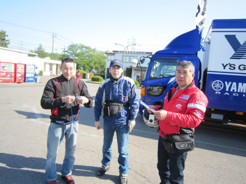 7:47 おはようございます K2Yから、応援にきてくれました。 店長のアイスエイジさんと、RYO@Mさん、そして岩井さん。 千葉からツーリングがてらの応援です。 |