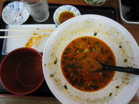 18:31 スタミナ肉味噌ラーメン 餃子セット 入り口脇にある券売機で食券を買って、待つこと約5分。 番号が呼ばれ、”スタミナ肉味噌ラーメンセット”が出てきました。 「ラーメン、でかっ!」 (^_^;) 割り箸のサイズからラーメンどんぶりの大きさを想像してもらえるとわかるけど、普通のラーメンどんぶりより二廻りほどでかい。 しかも、餃子は普通サイズの揚げ餃子が5コ。 そして、料理を出したおばちゃんが、 「ご飯、お代わりできますから!」 とかなり挑戦的な発言。 おかわり、無理! <(_ _)> と、最初から負け宣言。 それでは、『いただきます!』 |