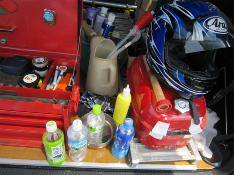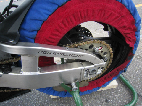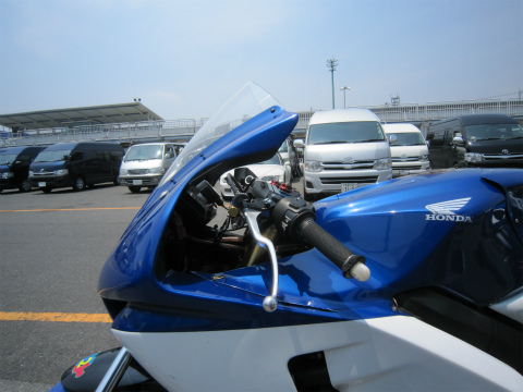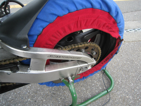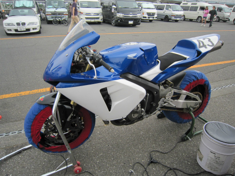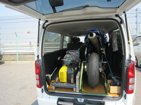 8:16 走行準備完了 バイクを下ろし、ガソリンを入れて、タイヤのエアーをチェックしてウォーマー巻いて準備完了。 後は走行時間が来るのを待つだけだ。 |