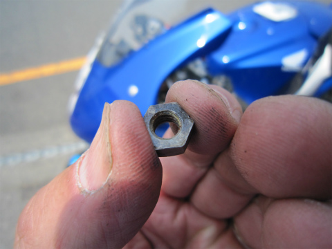11:32 クラッチのボルトが! クラッチのナットが外れて、ボルトが浮いてる! 「やばいね。 (-_-;) 」 走行中にクラッチ握れなくなったら、コーナーの進入で結構パニックだ。 最終コーナーの入り口だったら、そのまま真っ直ぐ行っちゃうかな。 まあ、偶然気がついて、良かった。 (^_^;) |