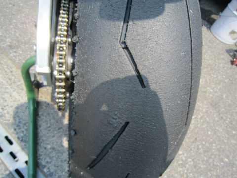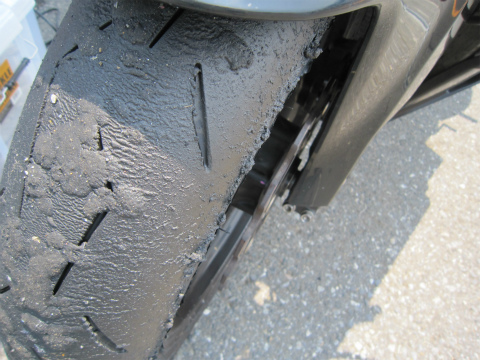 12:53 走行後のタイヤ これで、25分×5本。 リヤはきれいですね。 まだ十分使えそう。 PIRELLIの良いところはライフが長いところ。 タイヤ自体は国産に比べると高いですが、ライフが長いので、その分お得。 フロントは、タイヤかすをたくさん拾ってますが、溝はまだまだあるので、リヤ同様、まだ使えます。 |