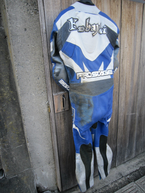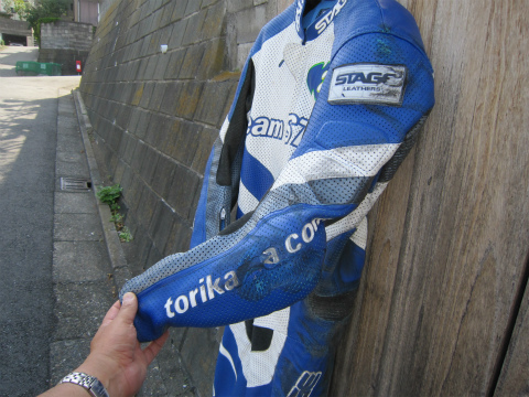 14:58 先週の まずは、まくら。 毎回かかさずこのホームページを読んでいる方なら承知のとおりですが、先週7月1日に開催された筑波ツーリスト・トロフィーにエントリーしました。 レースにエントリーすること自体が3年ぶり。 そんなレースでしたが、予選9番手からスタートした決勝、2周目の第1ヘアピンで接触転倒してしまいました。(汗) そして、本題。 今週末は休みが日曜日だけで、第2日曜日はK2Yは定休日。 自分もあまり時間がないので転倒して修理が必要な箇所を自宅で確認して部品を頼むことにします。 バイクの前に、まずは皮つなぎを取り出して。 コースオフして土が付いてしまったので、清掃がてら転倒箇所を確認。 この皮つなぎ、初転倒。 無傷だったのに・・・。 (ToT) そのおかげで、自分は打撲程度ですんだんだけどね。 左側に転倒したので、左のおしりの部分が擦れています。 |
