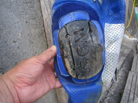14:59 パッドが バイクと路面との間に挟まれた左足は、パッドがちょうど路面と当たる形で滑ったので、パッドは良く減りましたが、皮つなぎ自体はほとんど傷無し。 ラッキーでした。 |
